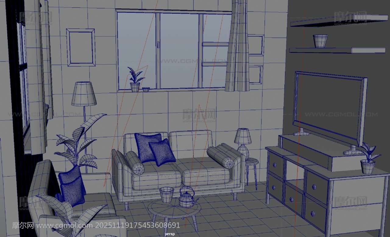 卡通客厅 动画室内 温馨客厅场景 客厅 沙发 室内 柜子 温馨室内 植物 花盆 沙发 抱枕 maya fbx obj